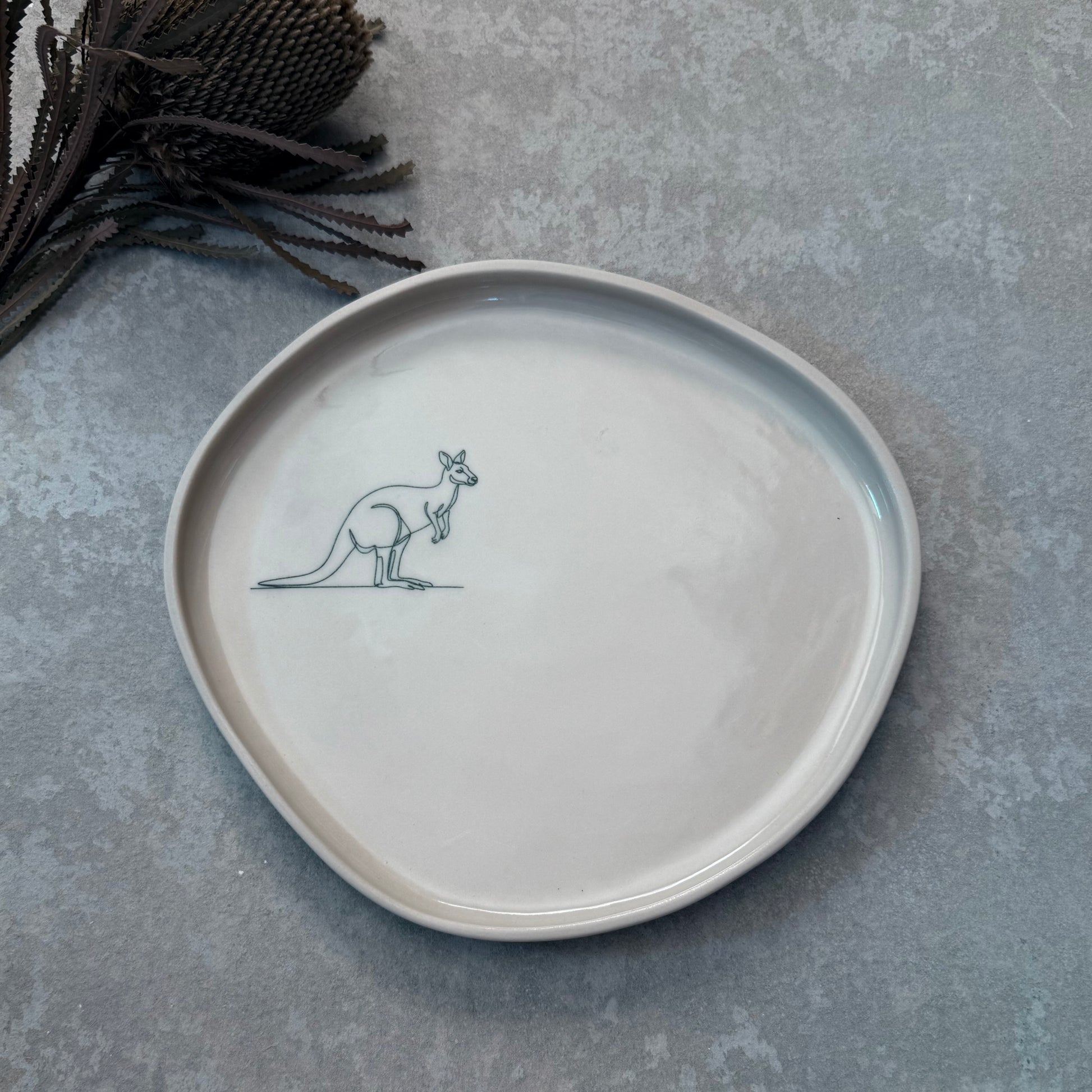 Hand-crafted from white stoneware, this large plate works beautifully as a dinner plate or serving tray. Finished with a glossy clear glaze and a fine black line illustration inspired by Australian native fauna, each piece brings nature and quiet character to the table.