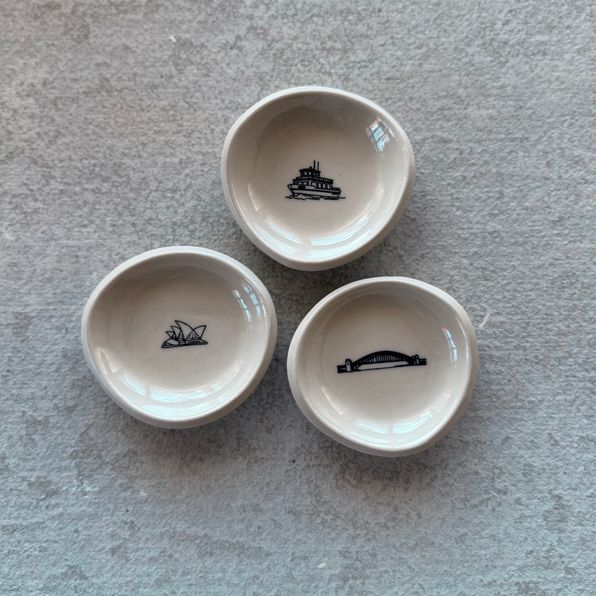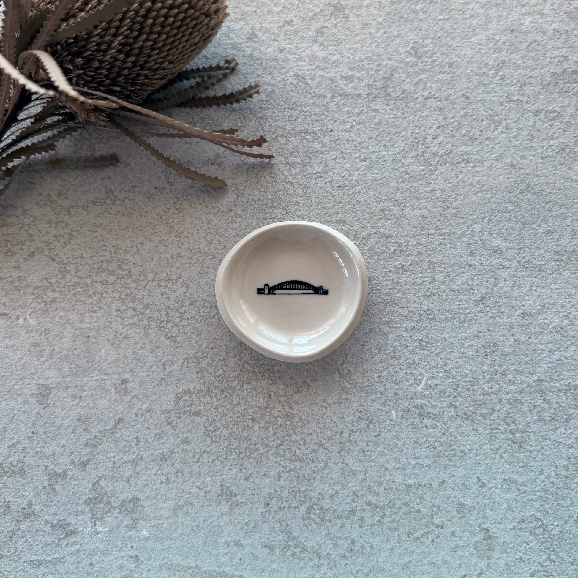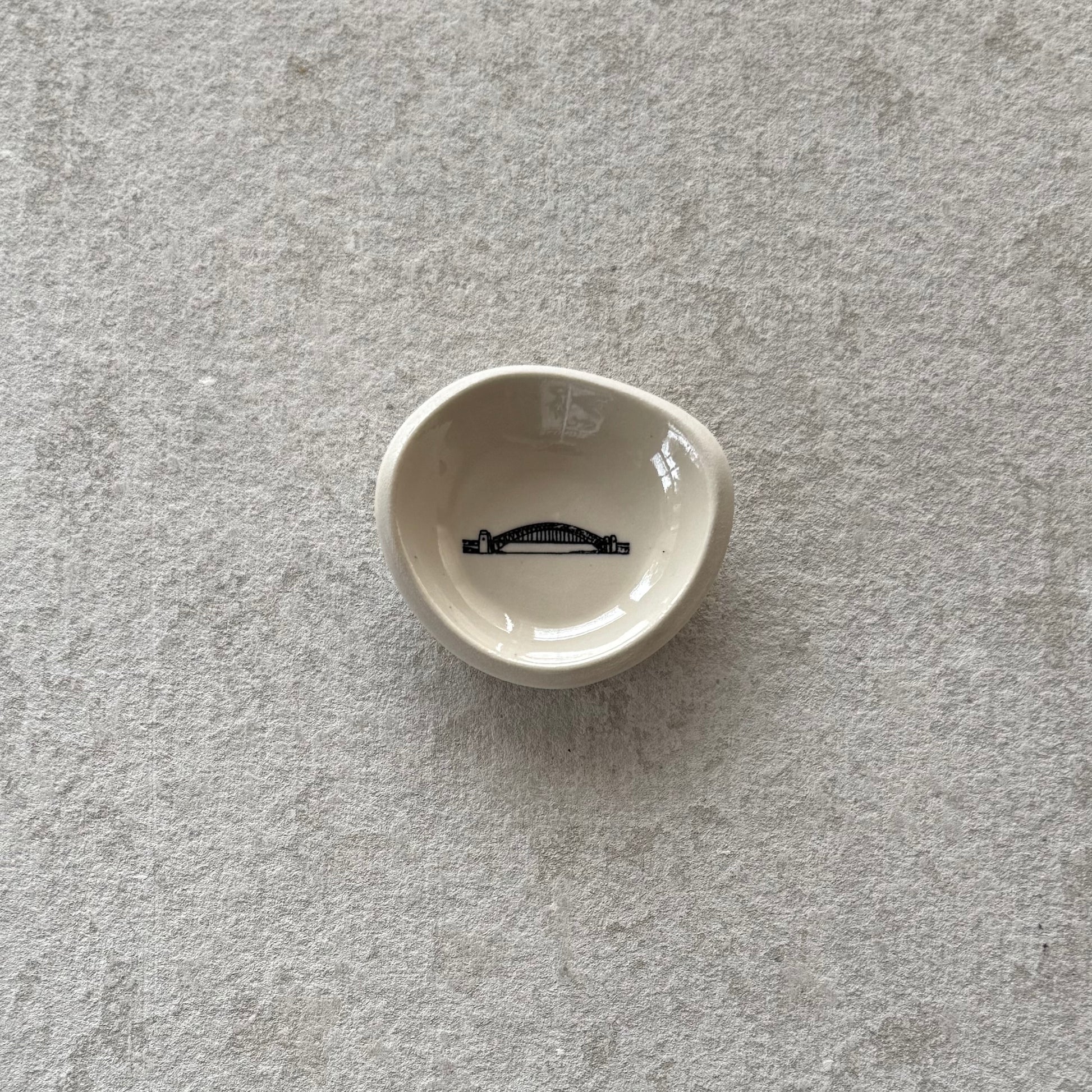 The Harbour Bridge Dish is part of the Illustrated Worlds collection, where iconic places are translated into fine black line illustration on white stoneware. Finished with a glossy clear glaze, this small ceramic dish becomes a subtle canvas celebrating Sydney’s most recognisable landmark.