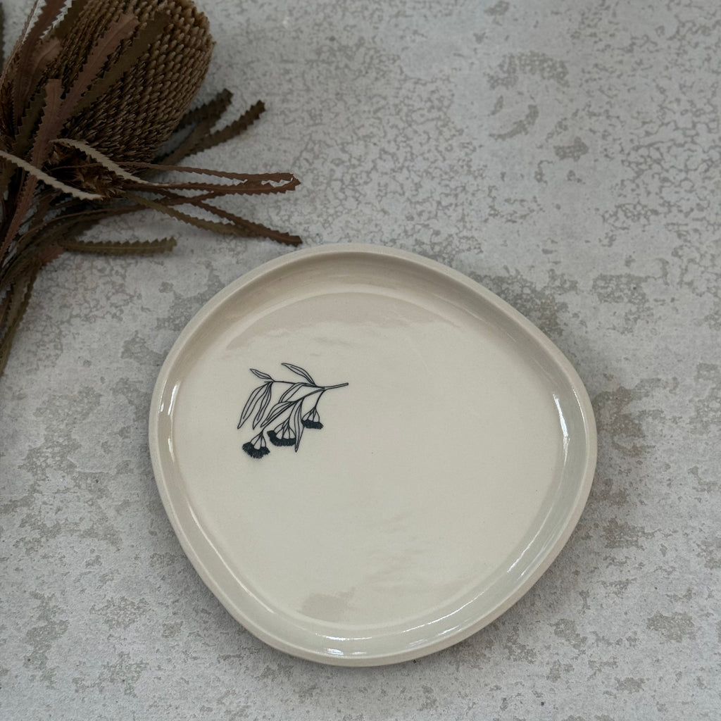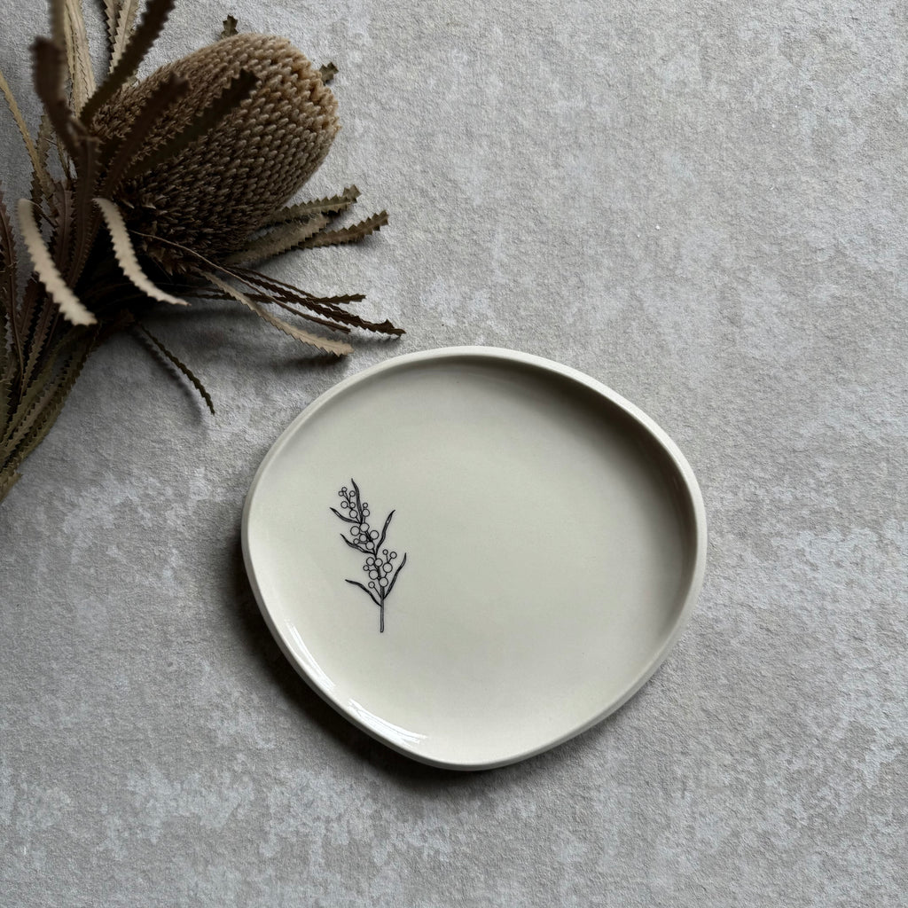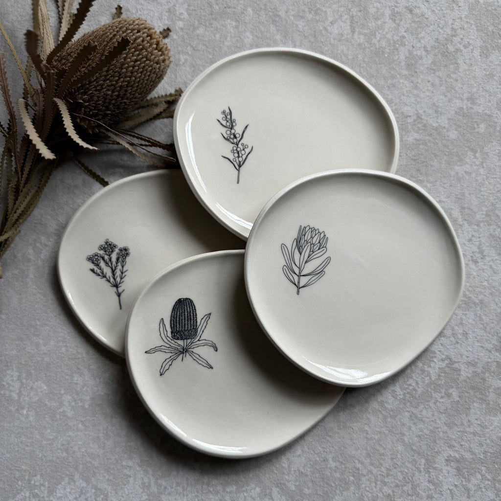This small ceramic plate from the Wildflower collection brings a subtle botanical accent to your daily rituals. Featuring one of five illustrations of native Australian flora, printed in black ink on smooth white clay, each plate is a quiet celebration of nature’s beauty.